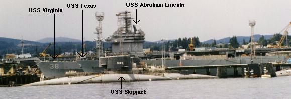 Here's a wide shot of a portion of the Bremerton waterfront, taken on August 31st, 1996. The Lincoln, of course, is still active. She was in PSNSY for a DDSRA. Virginia's and Texas' superstructures were removed as part of the decommissioning process. The aluminium from the superstructures was sold for scrap, about $0.16/lb, if I remember correctly. Removal of the superstructure facilitated Reactor Compartment removal, which occured sometime early 2000.![]() |